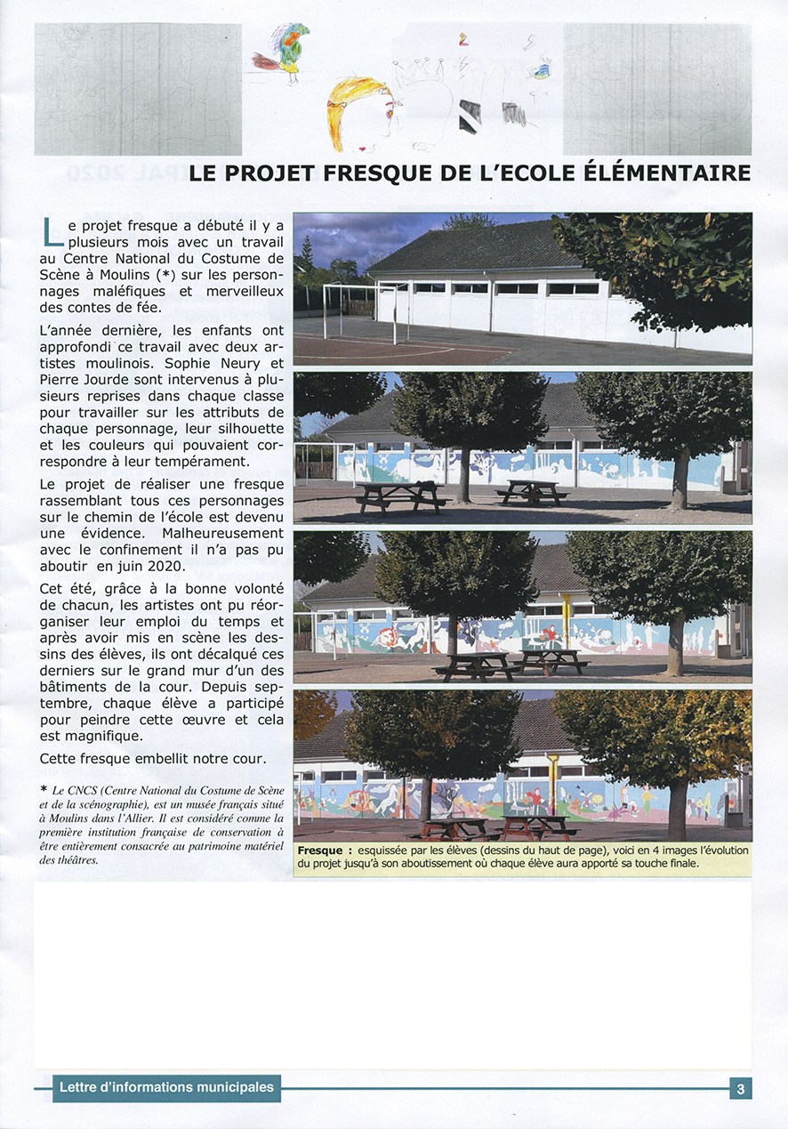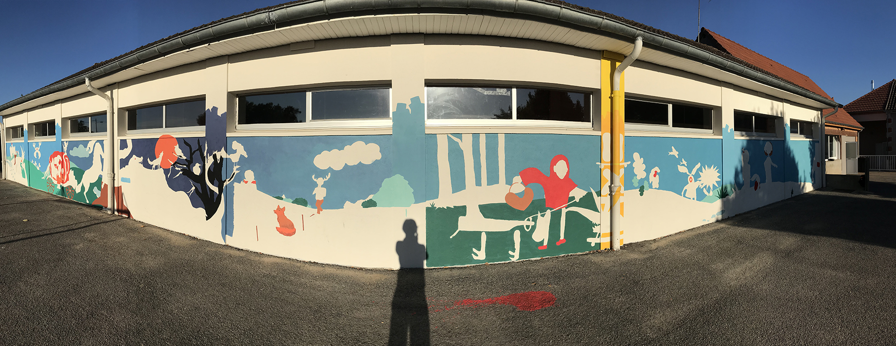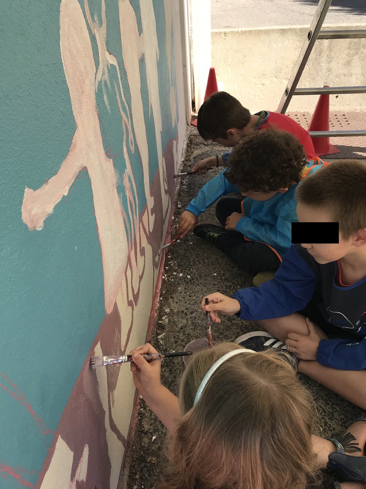 Création et réalisation de la fresque en collaboration avec l’artiste Pierre Jourde et les enfants de l’école.